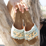 Voeg een flinke dosis stijl toe aan iedere look met deze slippers van Babouche die worden gekenmerkt door de franjes met mat goudkleurige ketting. De slippers met brede band zijn handgemaakt in mooie Italiaanse materalen en kwaliteit die zich volledig naar je voet zal vormen.